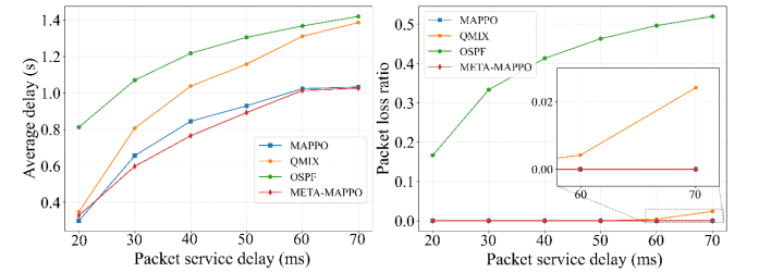 图2.不同分组服务时延条件下所提技术与基线算法在平均端到端时延(左图)和丢包率(右图)方面的性能对比